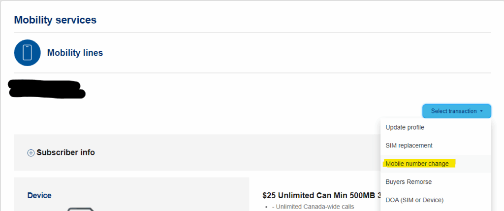 Once in the customer account for the Lucky SIM, expand the menu under ‘Select Transaction’ and click ‘Mobile number change’